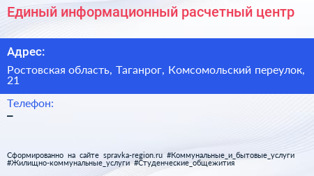 Единый информационный расчетный центр по адресу Ростовская область, Таганрог, Комсомольский переулок, 21 в дальнейшем Организация, размещена в следующих категориях: