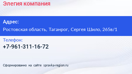 Элегия, компания по адресу Ростовская область, Таганрог, Сергея Шило, 265в/1 в дальнейшем Организация, размещена в следующих категориях: