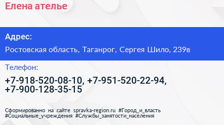 Елена, ателье по адресу Ростовская область, Таганрог, Сергея Шило, 239в в дальнейшем Организация, размещена в следующих категориях: