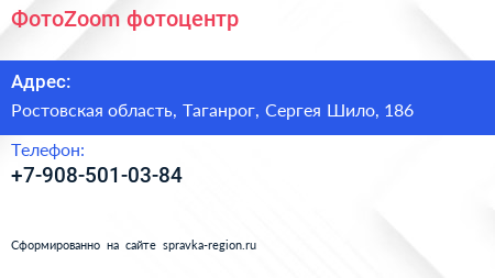 ФотоZoom, фотоцентр по адресу Ростовская область, Таганрог, Сергея Шило, 186 в дальнейшем Организация, размещена в следующих категориях:
