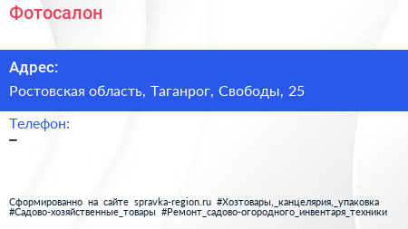 Фотосалон по адресу Ростовская область, Таганрог, Свободы, 25 в дальнейшем Организация, размещена в следующих категориях: