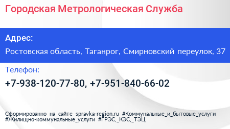 Городская Метрологическая Служба по адресу Ростовская область, Таганрог, Смирновский переулок, 37 в дальнейшем Организация, размещена в следующих категориях: