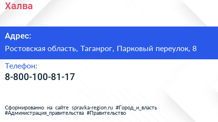 Халва по адресу Ростовская область, Таганрог, Парковый переулок, 8 в дальнейшем Организация, размещена в следующих категориях: