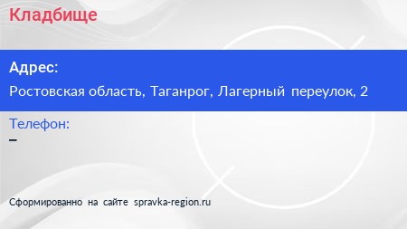 Кладбище по адресу Ростовская область, Таганрог, Лагерный переулок, 2 в дальнейшем Организация, размещена в следующих категориях: