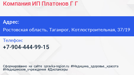 Компания, ИП Платонов Г.Г. по адресу Ростовская область, Таганрог, Котлостроительная, 37/19 в дальнейшем Организация, размещена в следующих категориях: