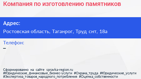Компания по изготовлению памятников по адресу Ростовская область, Таганрог, Труд снт, 18а в дальнейшем Организация, размещена в следующих категориях: