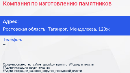 Компания по изготовлению памятников по адресу Ростовская область, Таганрог, Менделеева, 123ж в дальнейшем Организация, размещена в следующих категориях: