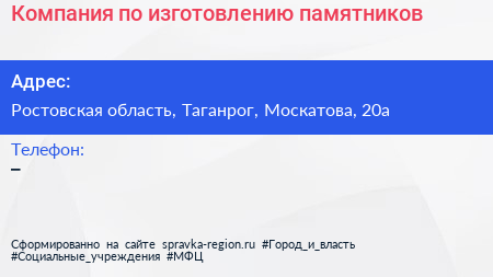 Компания по изготовлению памятников по адресу Ростовская область, Таганрог, Москатова, 20а в дальнейшем Организация, размещена в следующих категориях: