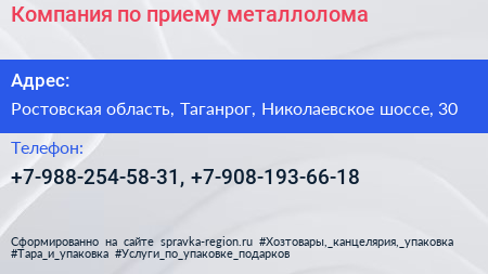 Компания по приему металлолома по адресу Ростовская область, Таганрог, Николаевское шоссе, 30 в дальнейшем Организация, размещена в следующих категориях: