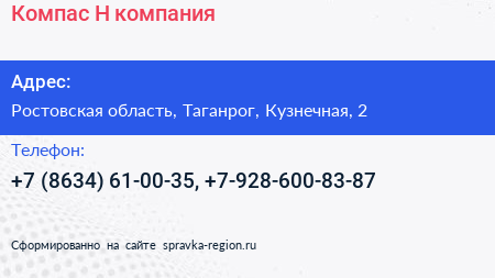 Компас-Н, компания по адресу Ростовская область, Таганрог, Кузнечная, 2 в дальнейшем Организация, размещена в следующих категориях: