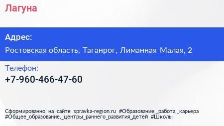 Лагуна по адресу Ростовская область, Таганрог, Лиманная Малая, 2 в дальнейшем Организация, размещена в следующих категориях: