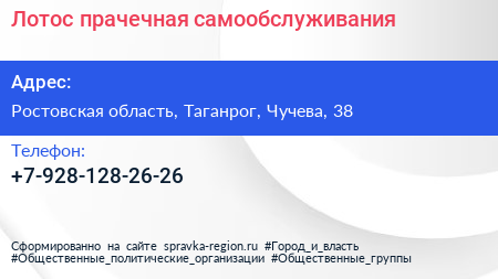Лотос, прачечная самообслуживания по адресу Ростовская область, Таганрог, Чучева, 38 в дальнейшем Организация, размещена в следующих категориях: