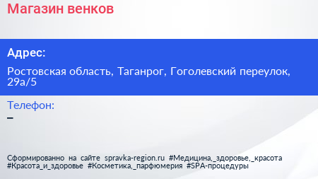 Магазин венков по адресу Ростовская область, Таганрог, Гоголевский переулок, 29а/5 в дальнейшем Организация, размещена в следующих категориях: