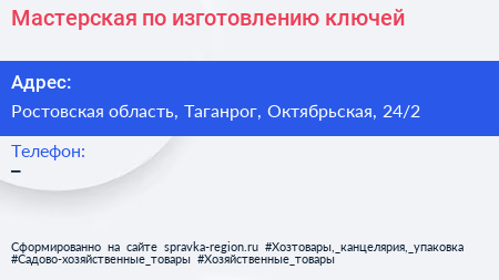 Мастерская по изготовлению ключей по адресу Ростовская область, Таганрог, Октябрьская, 24/2 в дальнейшем Организация, размещена в следующих категориях: