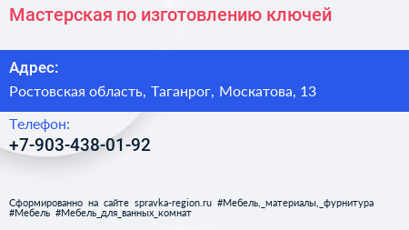 Мастерская по изготовлению ключей по адресу Ростовская область, Таганрог, Москатова, 13 в дальнейшем Организация, размещена в следующих категориях: