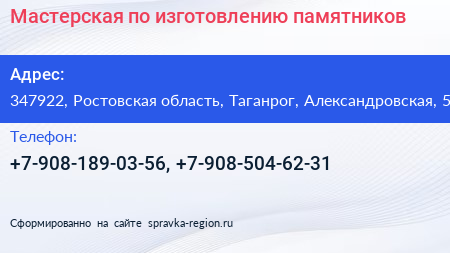 Мастерская по изготовлению памятников по адресу 347922, Ростовская область, Таганрог, Александровская, 5 в дальнейшем Организация, размещена в следующих категориях: