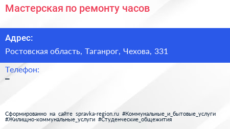 Мастерская по ремонту часов по адресу Ростовская область, Таганрог, Чехова, 331 в дальнейшем Организация, размещена в следующих категориях: