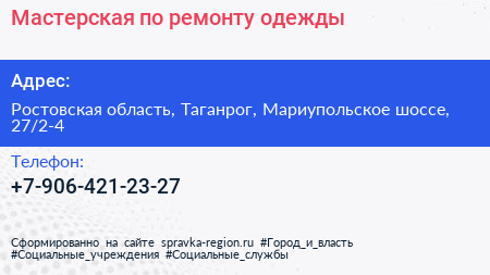 Мастерская по ремонту одежды по адресу Ростовская область, Таганрог, Мариупольское шоссе, 27/2-4 в дальнейшем Организация, размещена в следующих категориях: