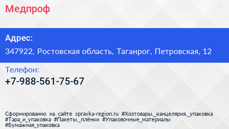 Медпроф по адресу 347922, Ростовская область, Таганрог, Петровская, 12 в дальнейшем Организация, размещена в следующих категориях: