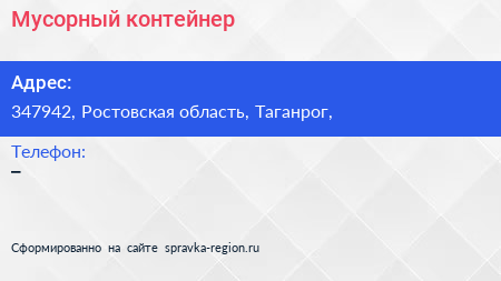 Мусорный контейнер по адресу 347942, Ростовская область, Таганрог, в дальнейшем Организация, размещена в следующих категориях:
