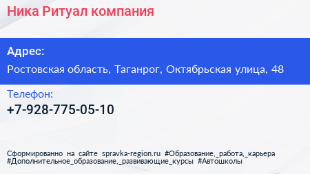 Ника Ритуал, компания по адресу Ростовская область, Таганрог, Октябрьская улица, 48 в дальнейшем Организация, размещена в следующих категориях: