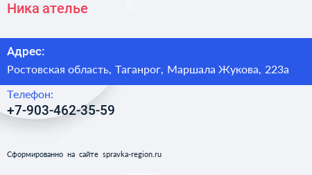 Ника, ателье по адресу Ростовская область, Таганрог, Маршала Жукова, 223а в дальнейшем Организация, размещена в следующих категориях: