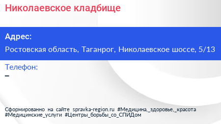 Николаевское кладбище по адресу Ростовская область, Таганрог, Николаевское шоссе, 5/13 в дальнейшем Организация, размещена в следующих категориях: