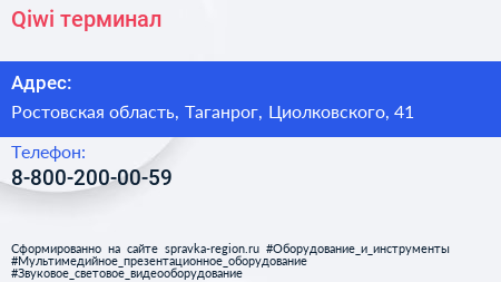 Qiwi, терминал по адресу Ростовская область, Таганрог, Циолковского, 41 в дальнейшем Организация, размещена в следующих категориях: