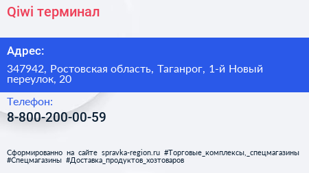 Qiwi, терминал по адресу 347942, Ростовская область, Таганрог, 1-й Новый переулок, 20 в дальнейшем Организация, размещена в следующих категориях: