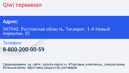Qiwi, терминал по адресу 347942, Ростовская область, Таганрог, 1-й Новый переулок, 35 в дальнейшем Организация, размещена в следующих категориях: