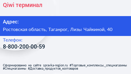 Qiwi, терминал по адресу Ростовская область, Таганрог, Лизы Чайкиной, 40 в дальнейшем Организация, размещена в следующих категориях: