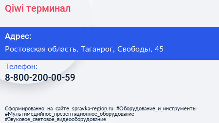 Qiwi, терминал по адресу Ростовская область, Таганрог, Свободы, 45 в дальнейшем Организация, размещена в следующих категориях: