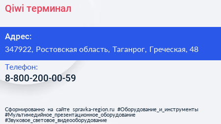Qiwi, терминал по адресу 347922, Ростовская область, Таганрог, Греческая, 48 в дальнейшем Организация, размещена в следующих категориях:
