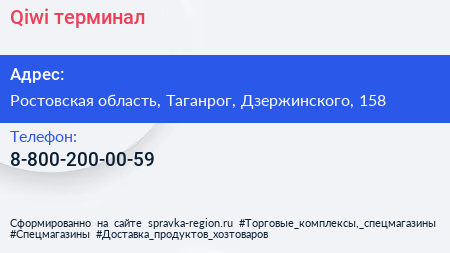 Qiwi, терминал по адресу Ростовская область, Таганрог, Дзержинского, 158 в дальнейшем Организация, размещена в следующих категориях: