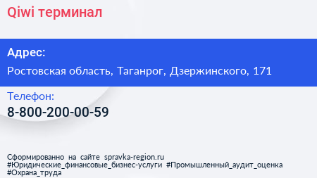 Qiwi, терминал по адресу Ростовская область, Таганрог, Дзержинского, 171 в дальнейшем Организация, размещена в следующих категориях: