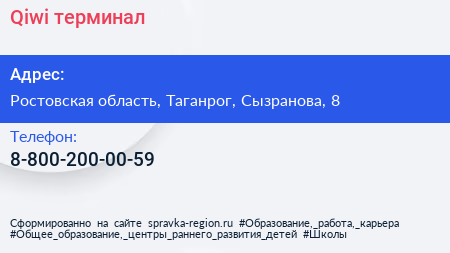 Qiwi, терминал по адресу Ростовская область, Таганрог, Сызранова, 8 в дальнейшем Организация, размещена в следующих категориях: