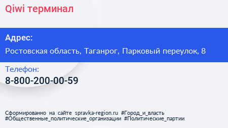 Qiwi, терминал по адресу Ростовская область, Таганрог, Парковый переулок, 8 в дальнейшем Организация, размещена в следующих категориях: