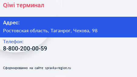 Qiwi, терминал по адресу Ростовская область, Таганрог, Чехова, 98 в дальнейшем Организация, размещена в следующих категориях: