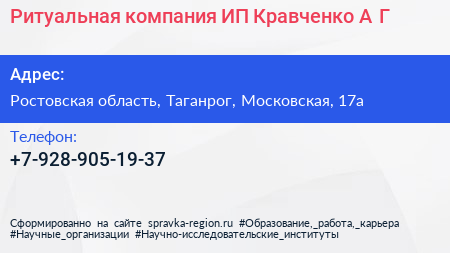 Ритуальная компания, ИП Кравченко А.Г. по адресу Ростовская область, Таганрог, Московская, 17а в дальнейшем Организация, размещена в следующих категориях: