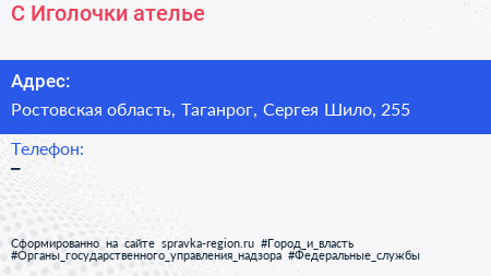 С Иголочки, ателье по адресу Ростовская область, Таганрог, Сергея Шило, 255 в дальнейшем Организация, размещена в следующих категориях: