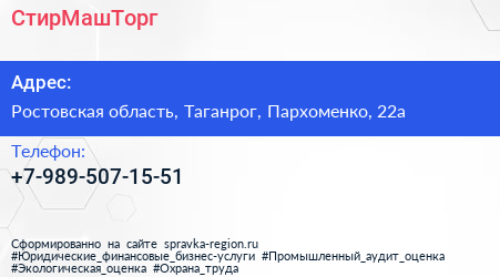 СтирМашТорг по адресу Ростовская область, Таганрог, Пархоменко, 22а в дальнейшем Организация, размещена в следующих категориях: