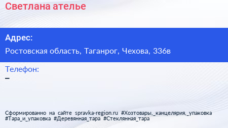 Светлана, ателье по адресу Ростовская область, Таганрог, Чехова, 336в в дальнейшем Организация, размещена в следующих категориях: