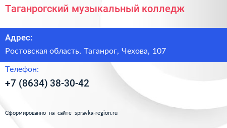 Таганрогский музыкальный колледж по адресу Ростовская область, Таганрог, Чехова, 107 в дальнейшем Организация, размещена в следующих категориях: