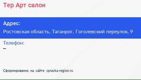 Тер-Арт, салон по адресу Ростовская область, Таганрог, Гоголевский переулок, 9 в дальнейшем Организация, размещена в следующих категориях: