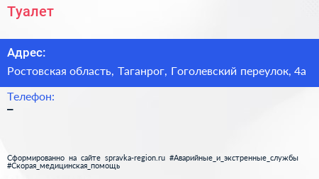 Туалет по адресу Ростовская область, Таганрог, Гоголевский переулок, 4а в дальнейшем Организация, размещена в следующих категориях: