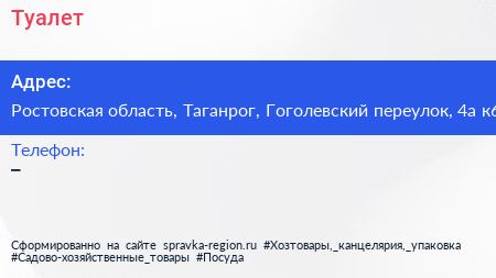 Туалет по адресу Ростовская область, Таганрог, Гоголевский переулок, 4а к6 в дальнейшем Организация, размещена в следующих категориях: