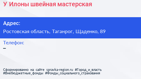 У Илоны, швейная мастерская по адресу Ростовская область, Таганрог, Щаденко, 89 в дальнейшем Организация, размещена в следующих категориях: