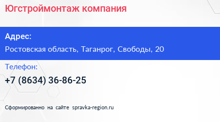 Югстроймонтаж, компания по адресу Ростовская область, Таганрог, Свободы, 20 в дальнейшем Организация, размещена в следующих категориях: