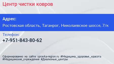 Центр чистки ковров по адресу Ростовская область, Таганрог, Николаевское шоссе, 7/к в дальнейшем Организация, размещена в следующих категориях: