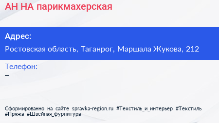 АН-НА, парикмахерская по адресу Ростовская область, Таганрог, Маршала Жукова, 212 в дальнейшем Организация, размещена в следующих категориях: